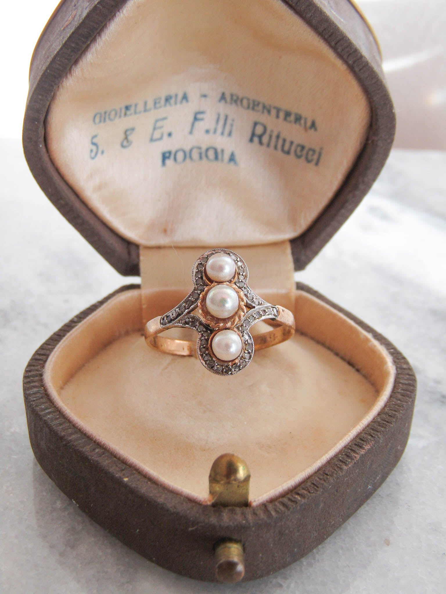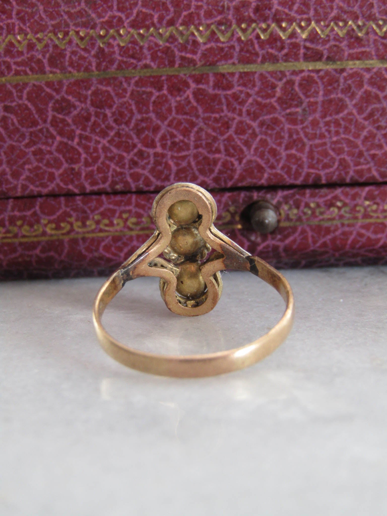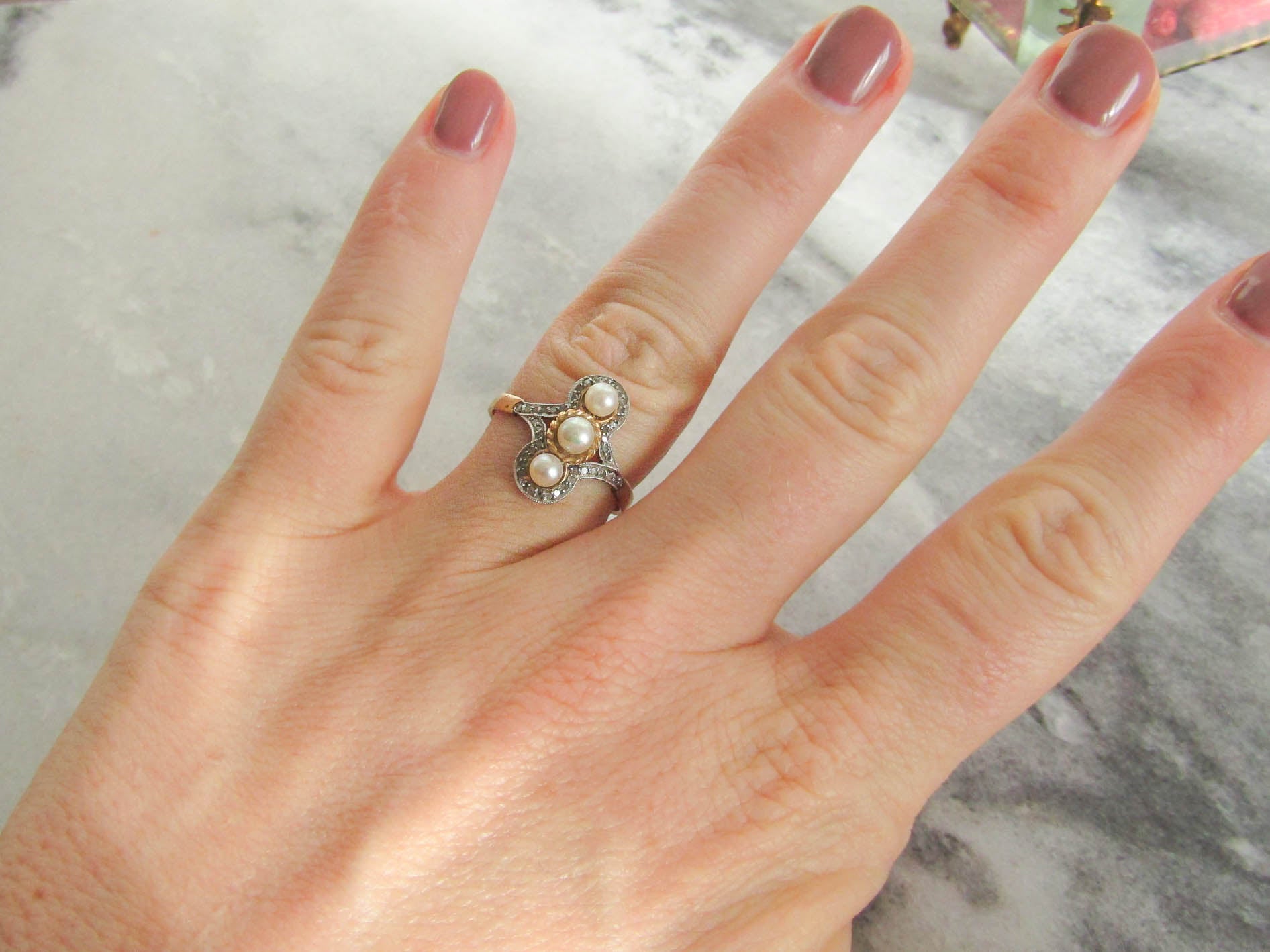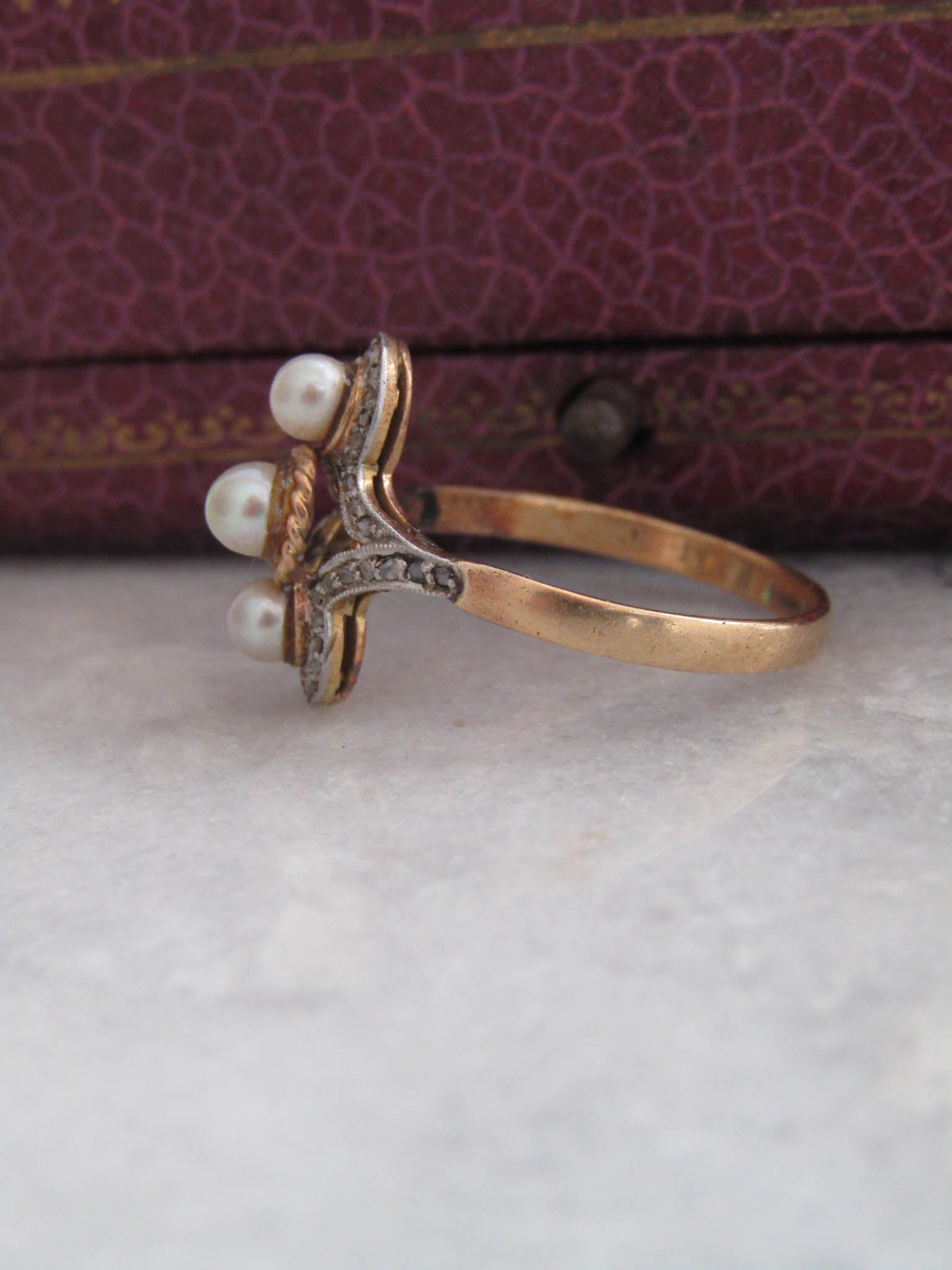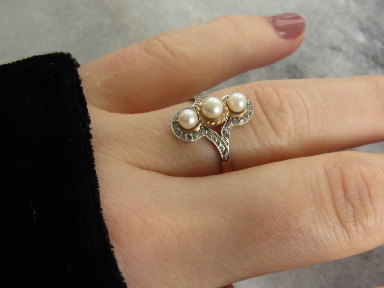 This sweet beauty was most probably used an an engagement ring as the interior band is engraved with a date that has been worn with time. It features a rich, buttery yellow gold band with a platinum head inlaid with diamond chips and three large pearls. As the ring was crafted around the turn of the century, it is highly likely that the pearls are natural as the ring predates the manufacture of cultured pearls. It has a sought after trilogy shield design which was very "of the era" and difficult to find nowadays. The ring itself is a beautiful reminder of a time gone by and love that persists through the ages. It is obvious that it was a cherished piece as the band is well worn, standing as a testament to its importance to the wearer. The hallmark is no longer visible on the band but the ring tests as 18k gold by touch stone and the head tests as platinum, typical of the era and standard for French jewelry.