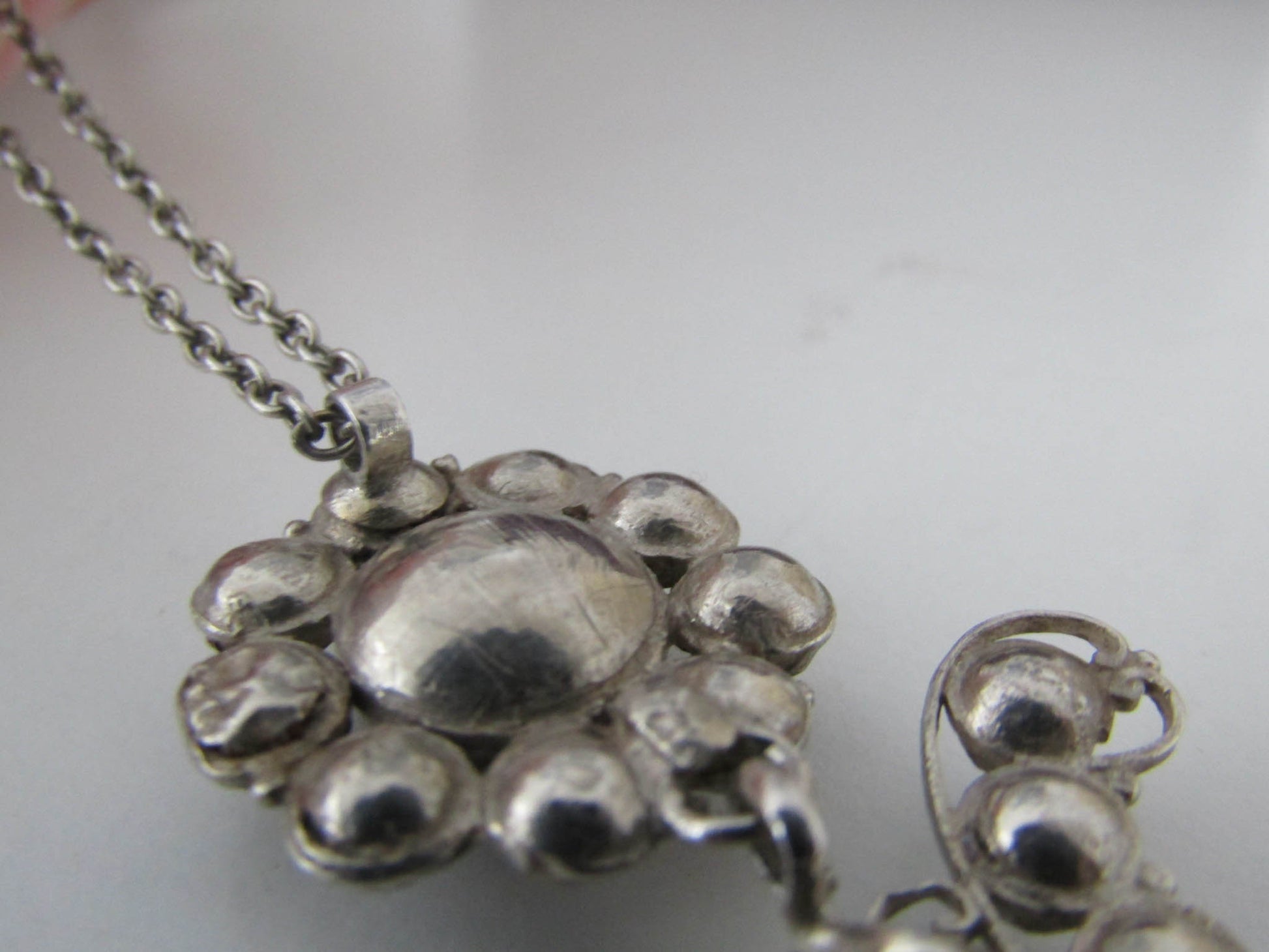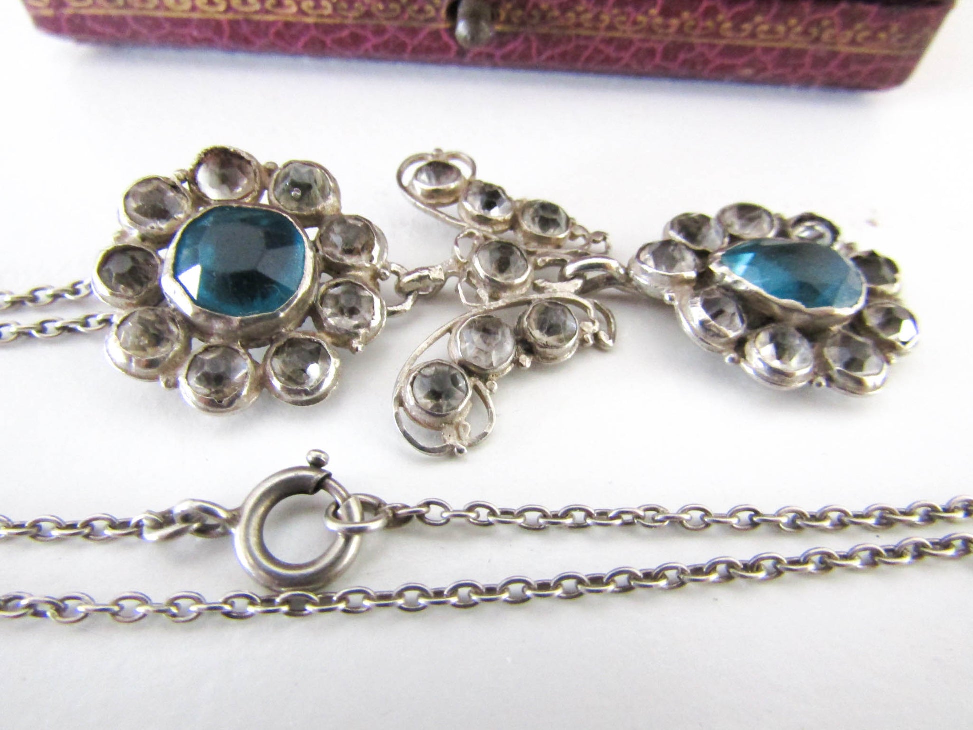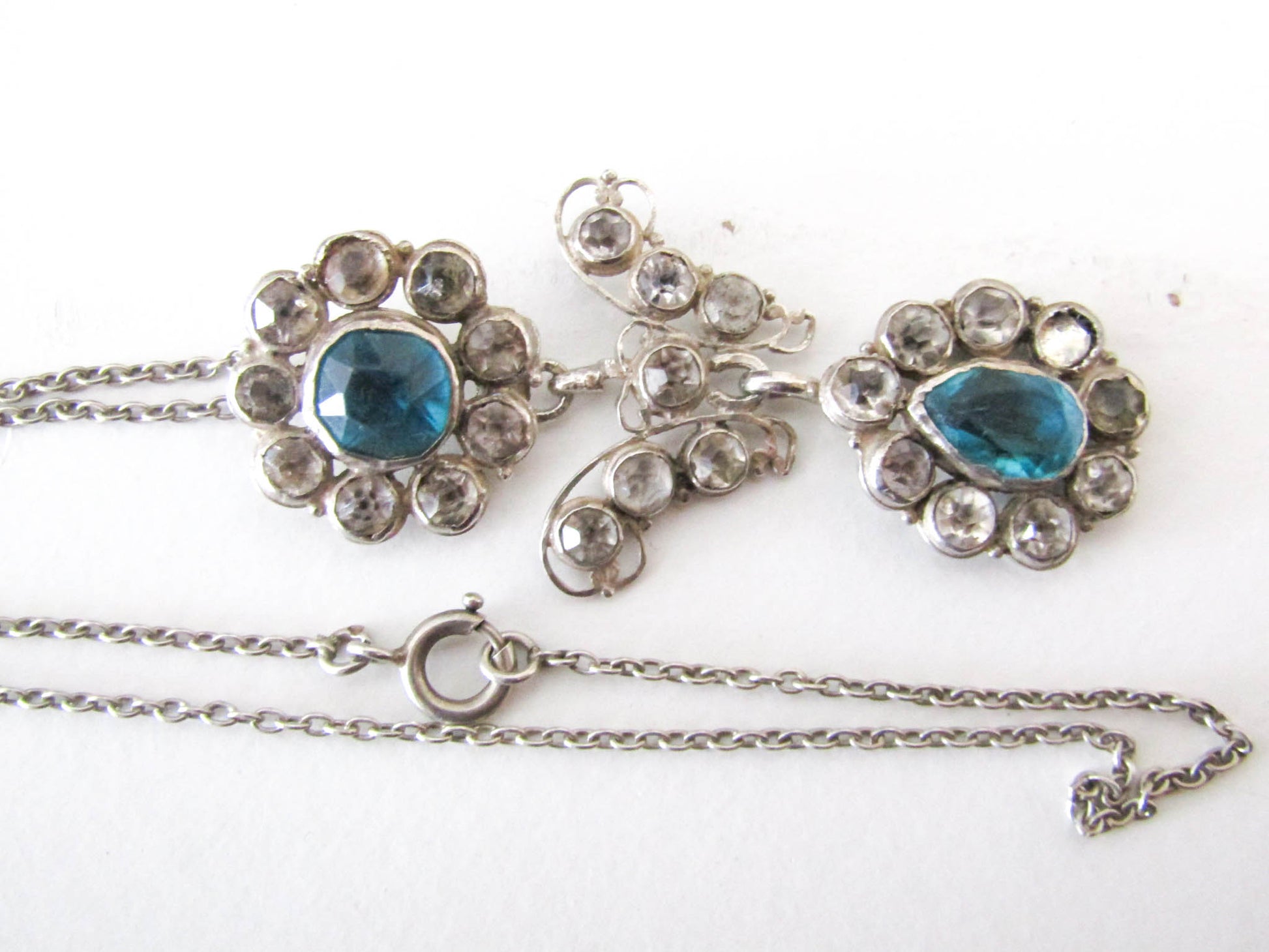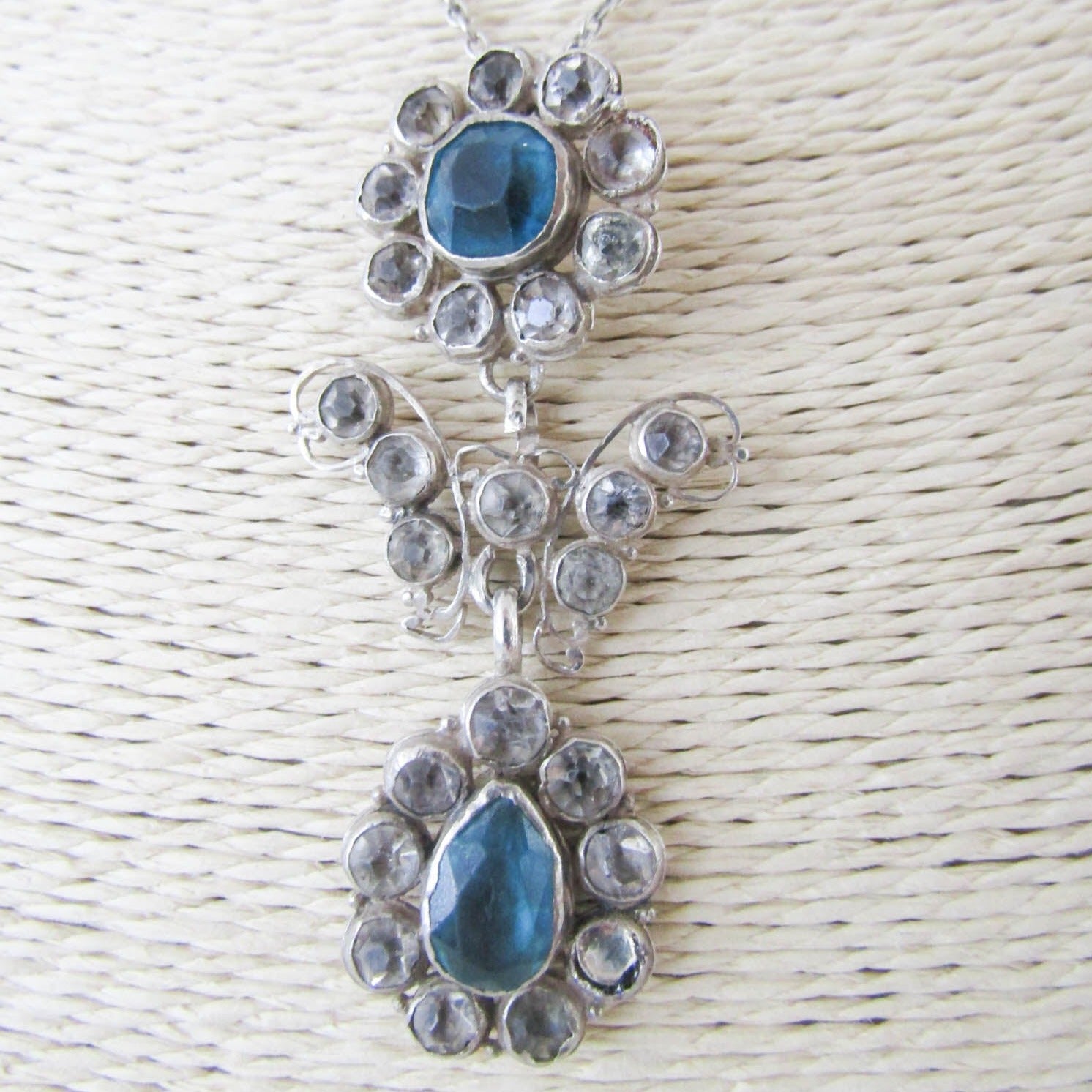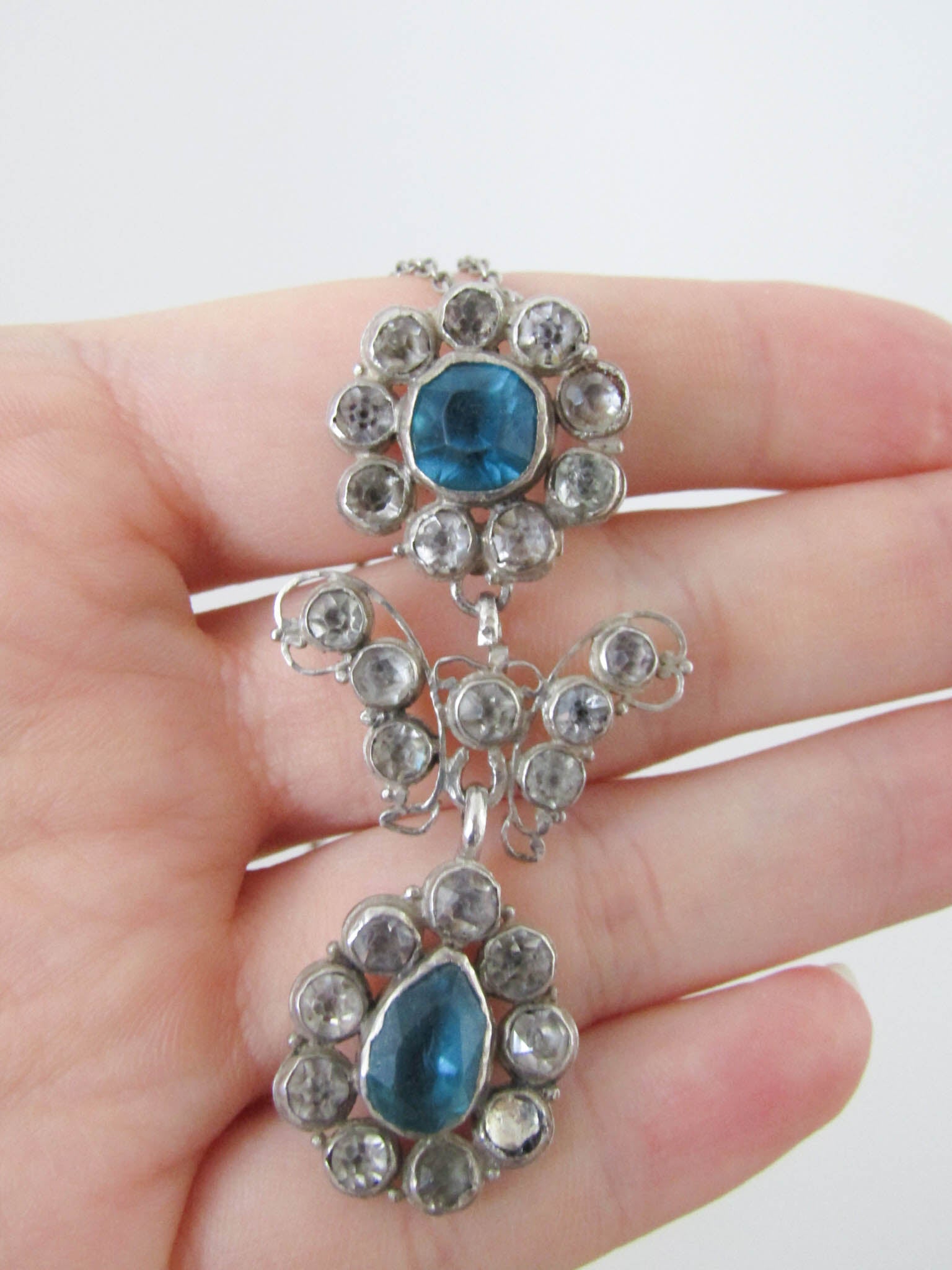 Featuring delicate silver work, foil backing, and antique black dot paste it is a beautiful example of the craftsmanship of the era. Paste itself was a very labor intensive process which involved hand cutting and polishing glass as one would a gemstone. Very high quality paste, as we can see here, had a black dot painted on the bottom of the glass to imitate the open cutlet of a diamond. The settings in these times were made around the gemstones and this pendant shows collets which hold the stones in place. Over time, a few have been replaced, probably in the early 1900s. There is one more noticeable than the others which features a rose cut instead of the single cut of the other paste stones. The turquoise blue of the paste is an unusual and rare color which looks lovely set against the light shine of the clear cut paste. Georgian jewelry is in high demand these days and it's value is constantly increasing as it they are rare and it is difficult to find pieces in good condition. While this piece wears charming signs of time and age it is a lovely piece with lots of wear left that can accompany you for many years.