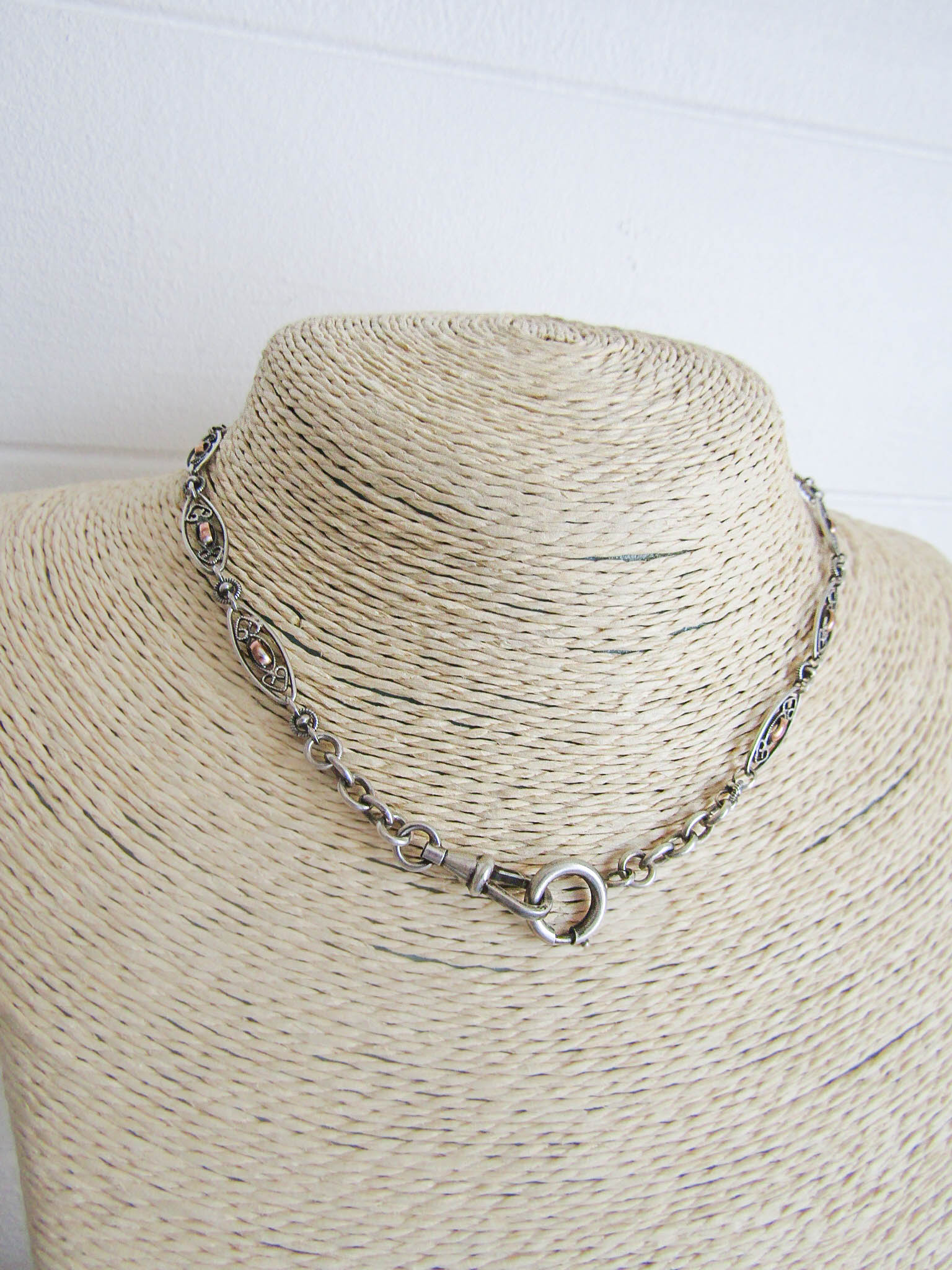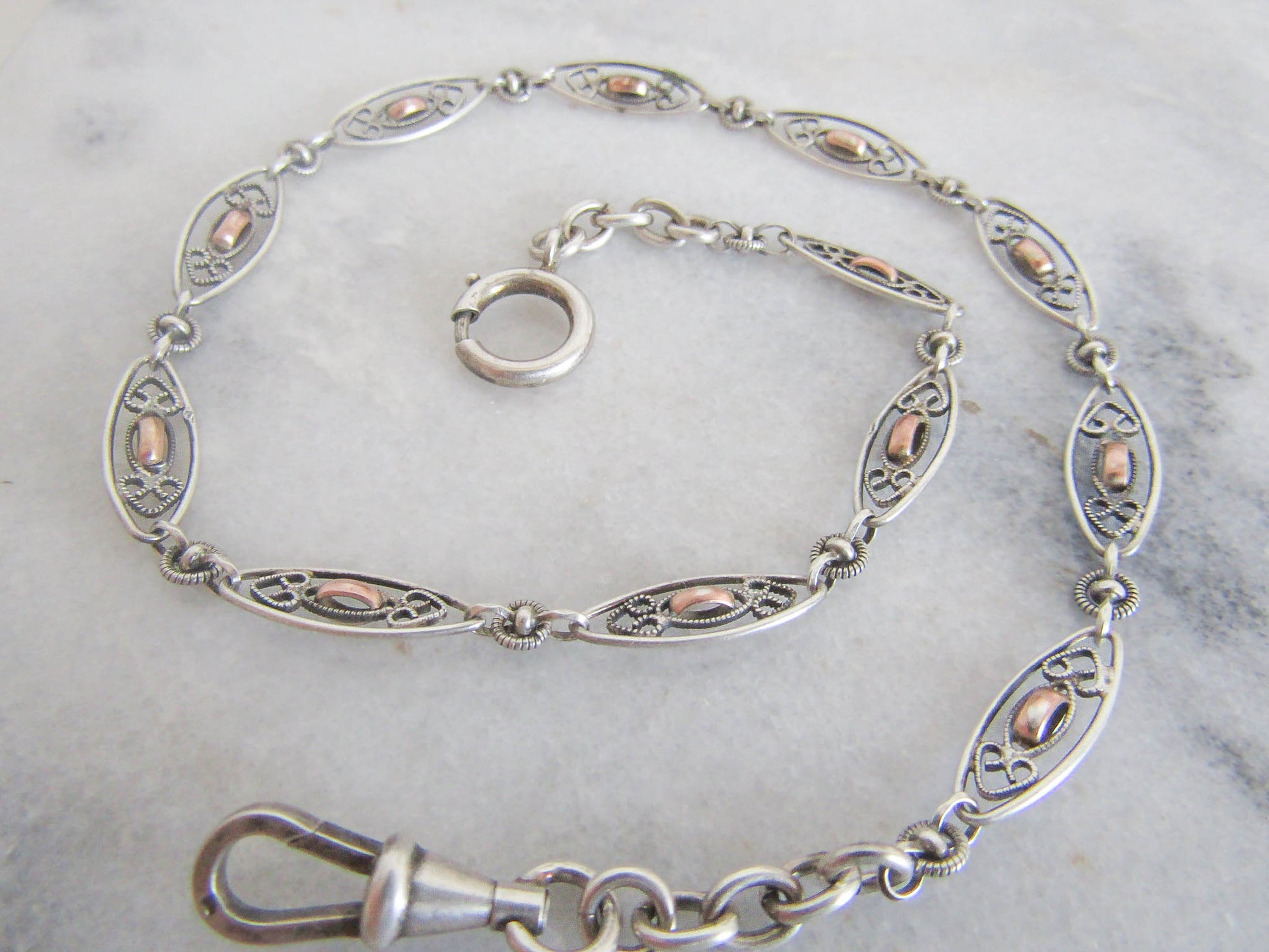 Silver Filigree Gold Fill Watch Chain, Antique French Victorian Watch Chain with Dog Clip Clasp and Spring Ring