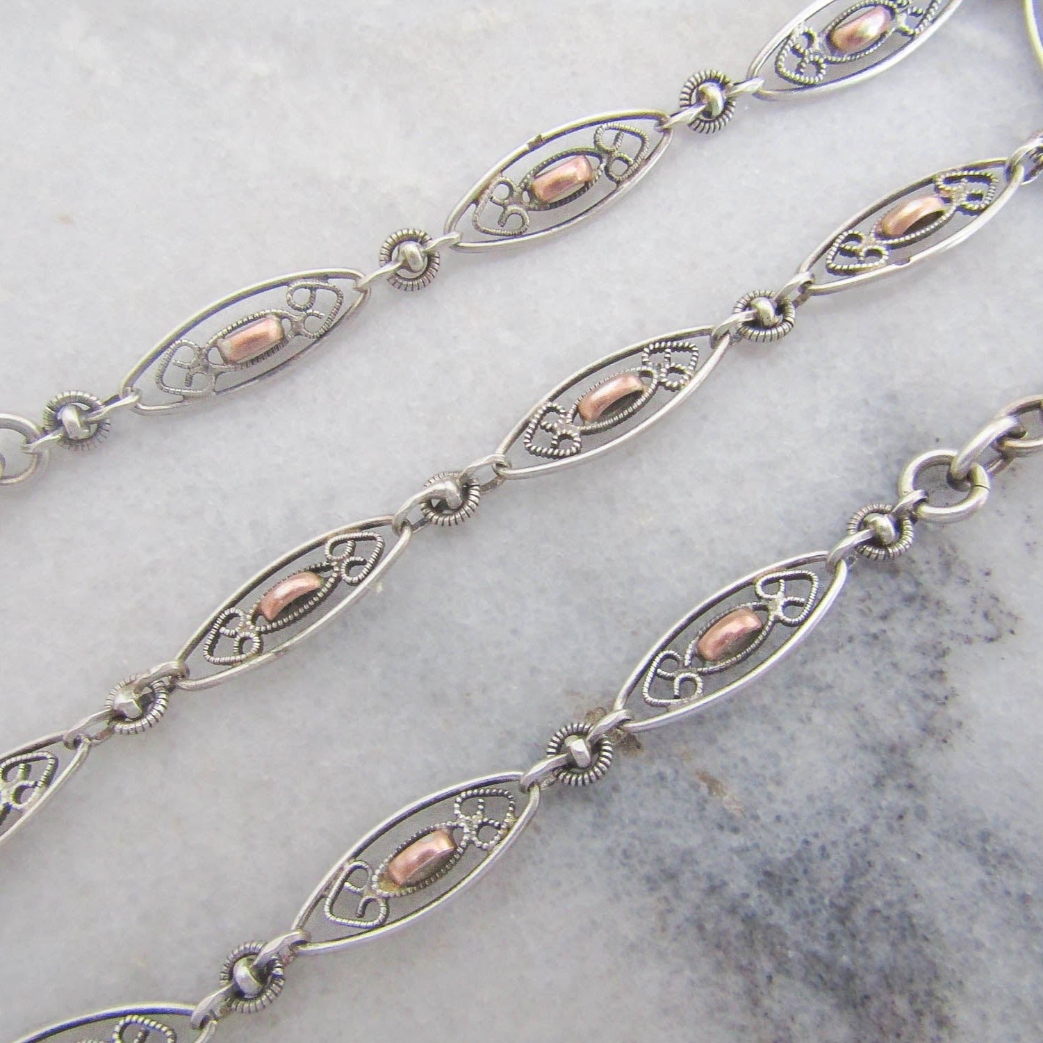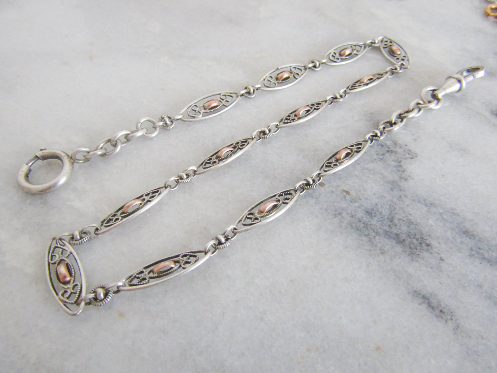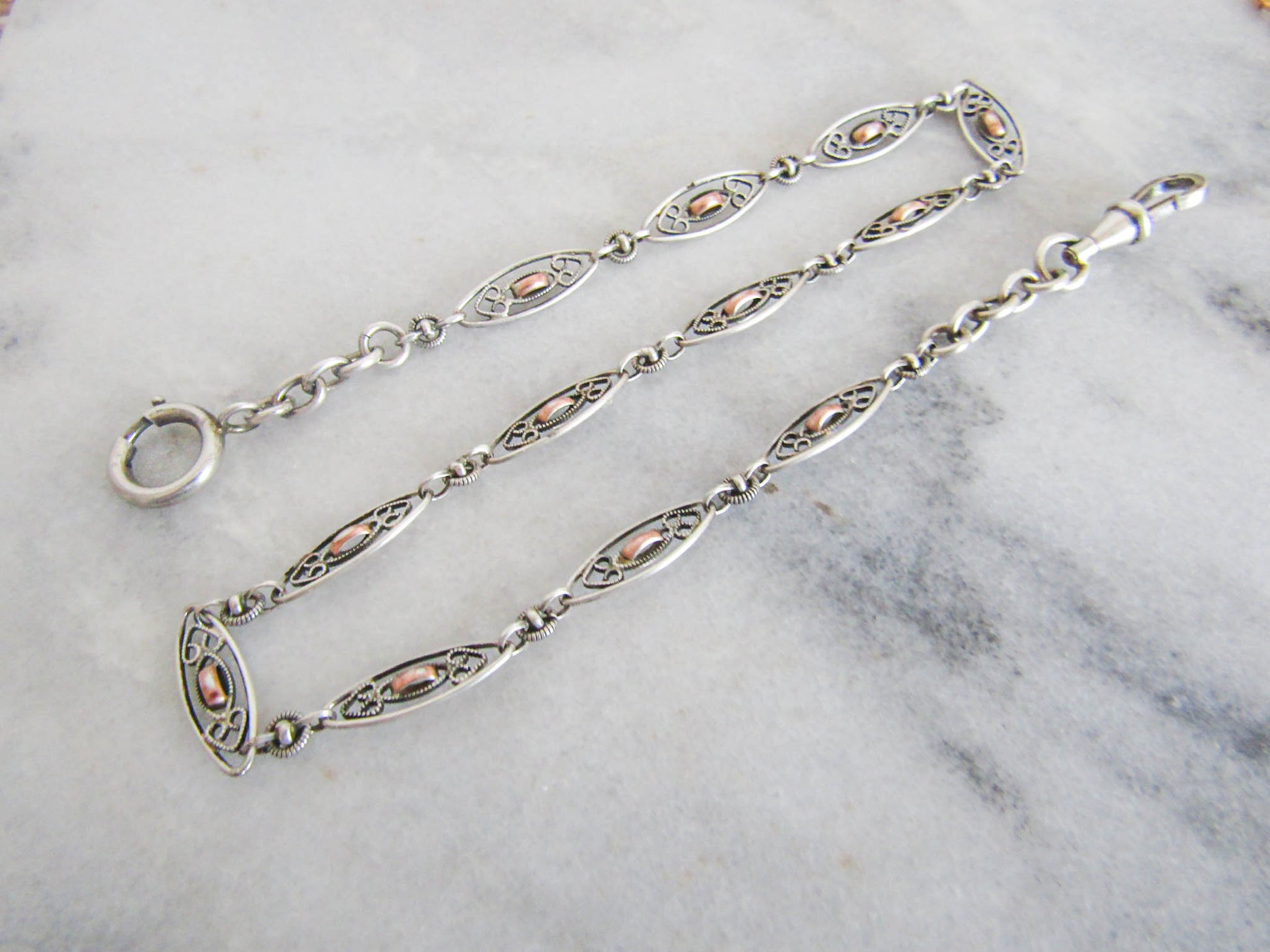 This antique watch chain feature navette links with interior rose gold fill and filigree hearts. This chain's true splendor is best appreciated in person, as the gold fill creates a stunning contrast against the silver backdrop. I love the design as it subtle but sweet with the hearts bringing a very romantic and whimsical touch. It makes for a very unique style. Its adaptable length makes it a versatile accessory, suitable as a choker necklace for a petite neck or a graceful bracelet when wrapped twice. Crafted from 800 silver, the bracelet is hallmarked with a crab on the navettes.