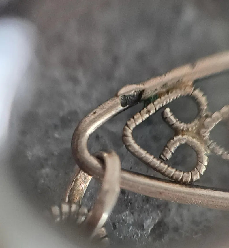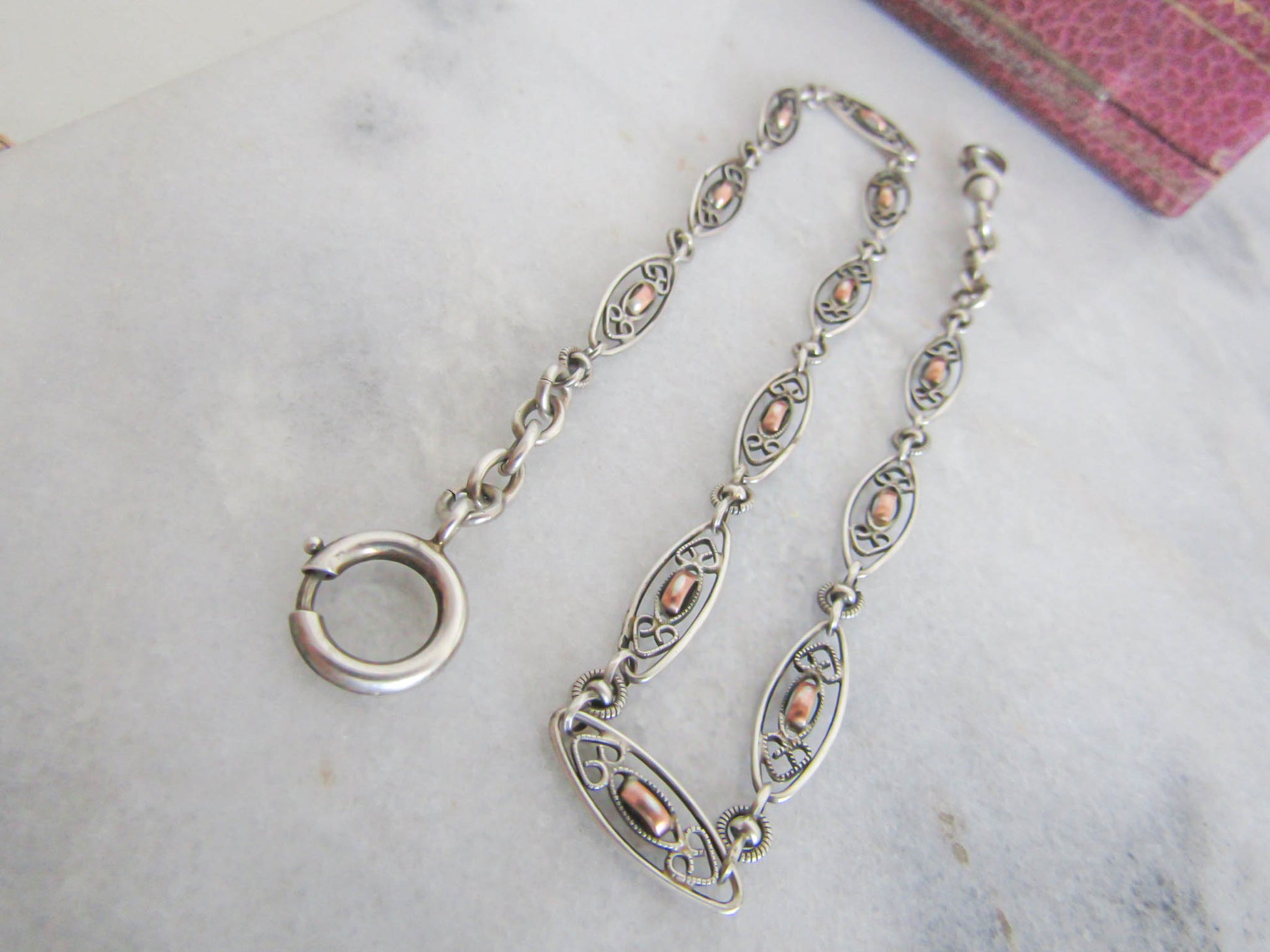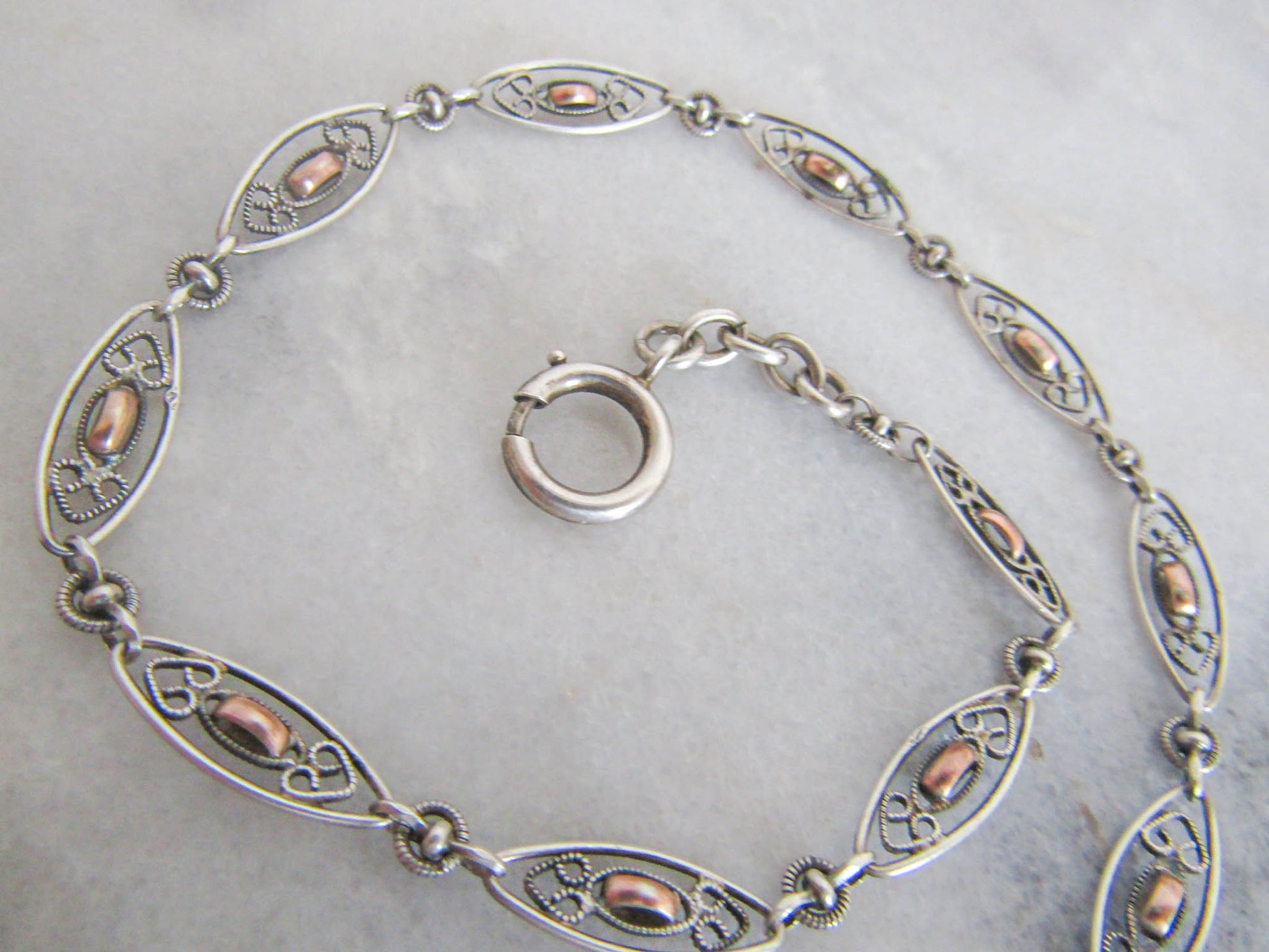This antique watch chain feature navette links with interior rose gold fill and filigree hearts. This chain's true splendor is best appreciated in person, as the gold fill creates a stunning contrast against the silver backdrop. I love the design as it subtle but sweet with the hearts bringing a very romantic and whimsical touch. It makes for a very unique style. Its adaptable length makes it a versatile accessory, suitable as a choker necklace for a petite neck or a graceful bracelet when wrapped twice. Crafted from 800 silver, the bracelet is hallmarked with a crab on the navettes.