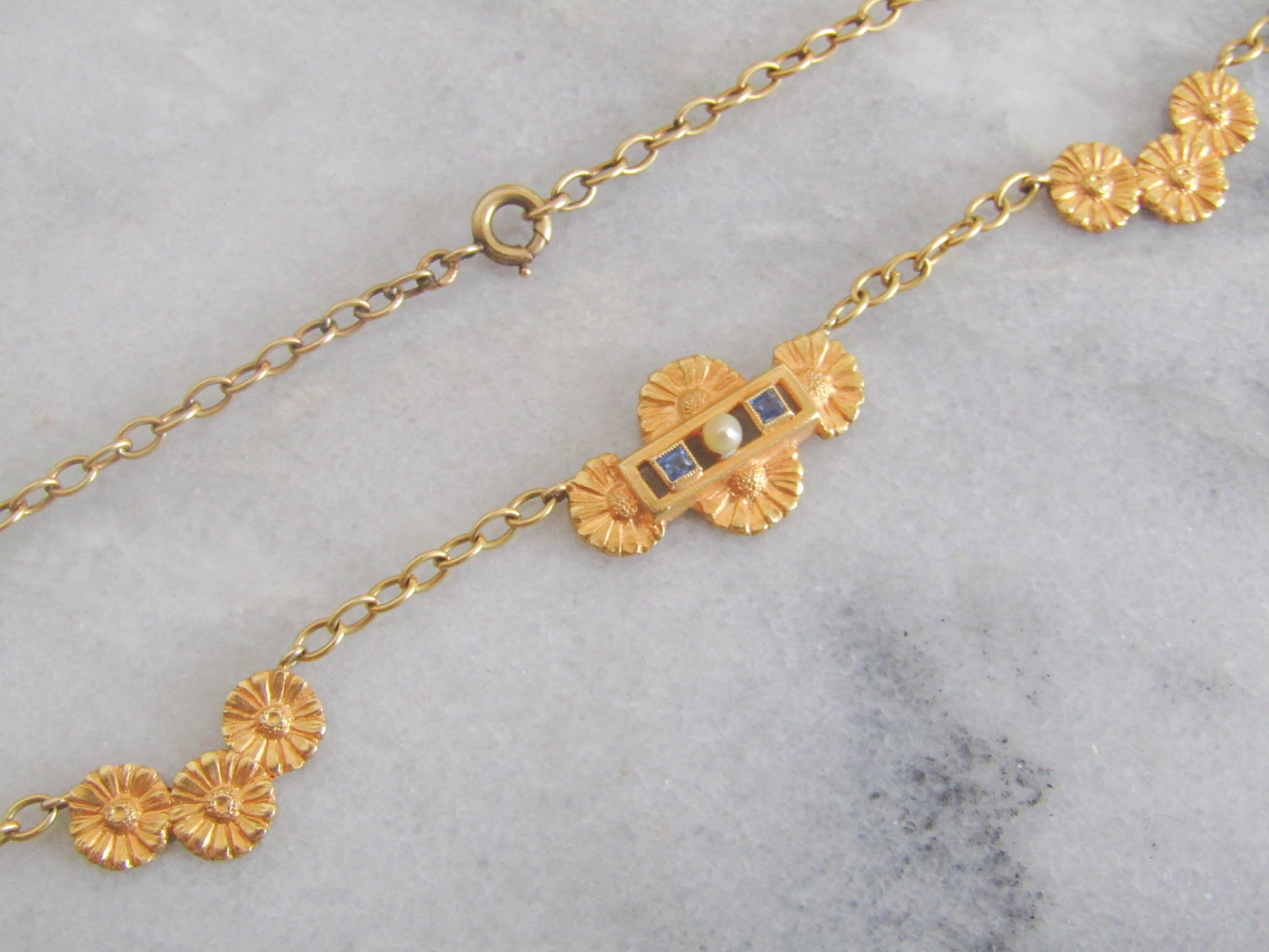 This stunning drapery necklace is crafted from 18k gold and is a typical example of French early 20th century design. Art Nouveau in style, it is delightful in its natural imagery. As with many antique pieces, there remains a hidden symbolism with the choice of daisy as a motif. In the Victorian Era, daisies symbolized innocence and loyalty. Often this style of necklace was given to a romantic partner or given as a wedding gift. Adding an extra touch of beauty and elegance is the addition of two calibrated sapphires centered with a natural pearl which decorate the central daisy cluster.