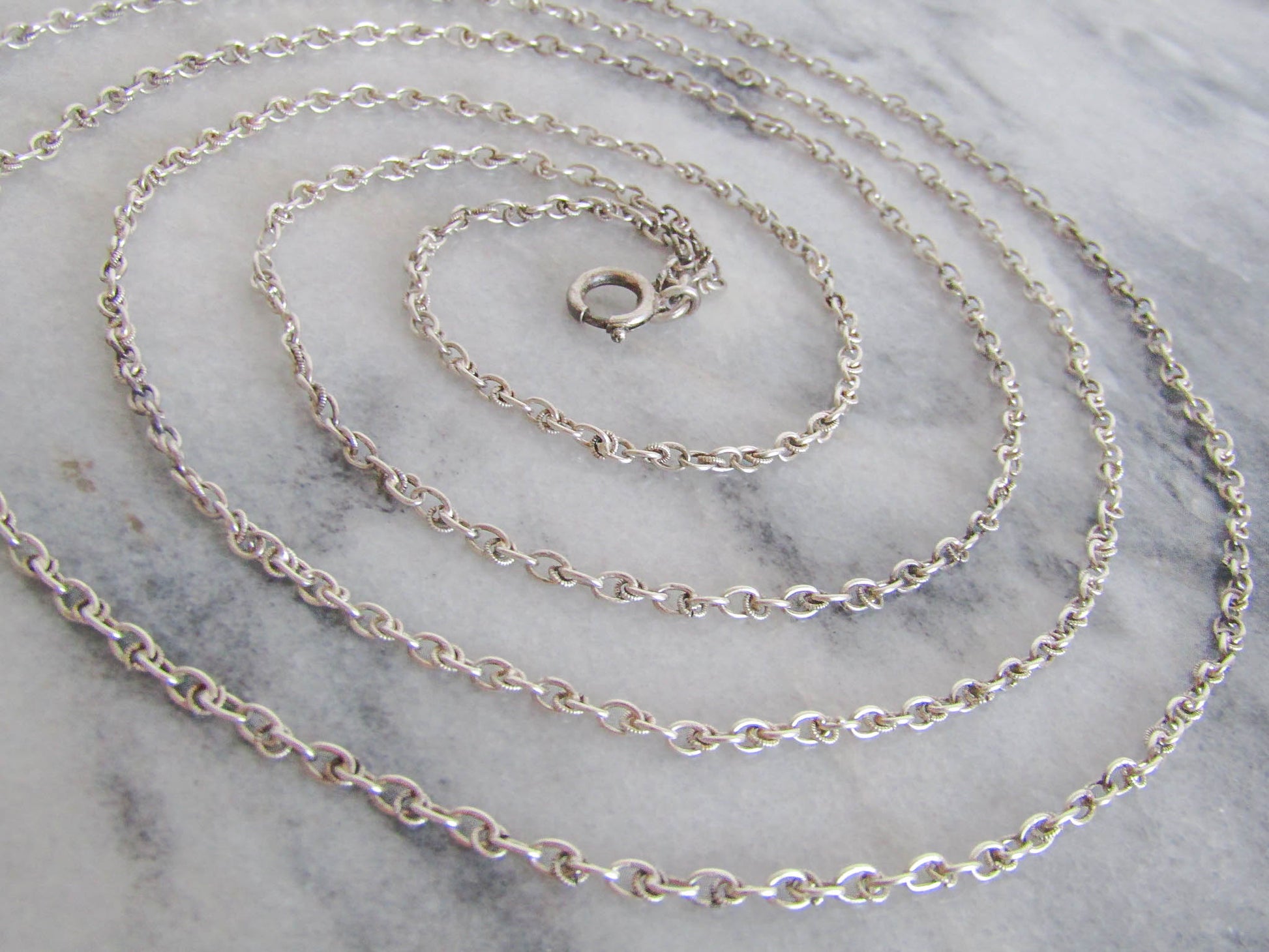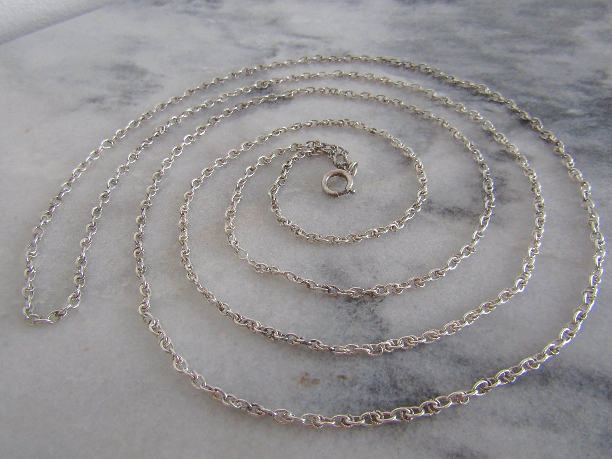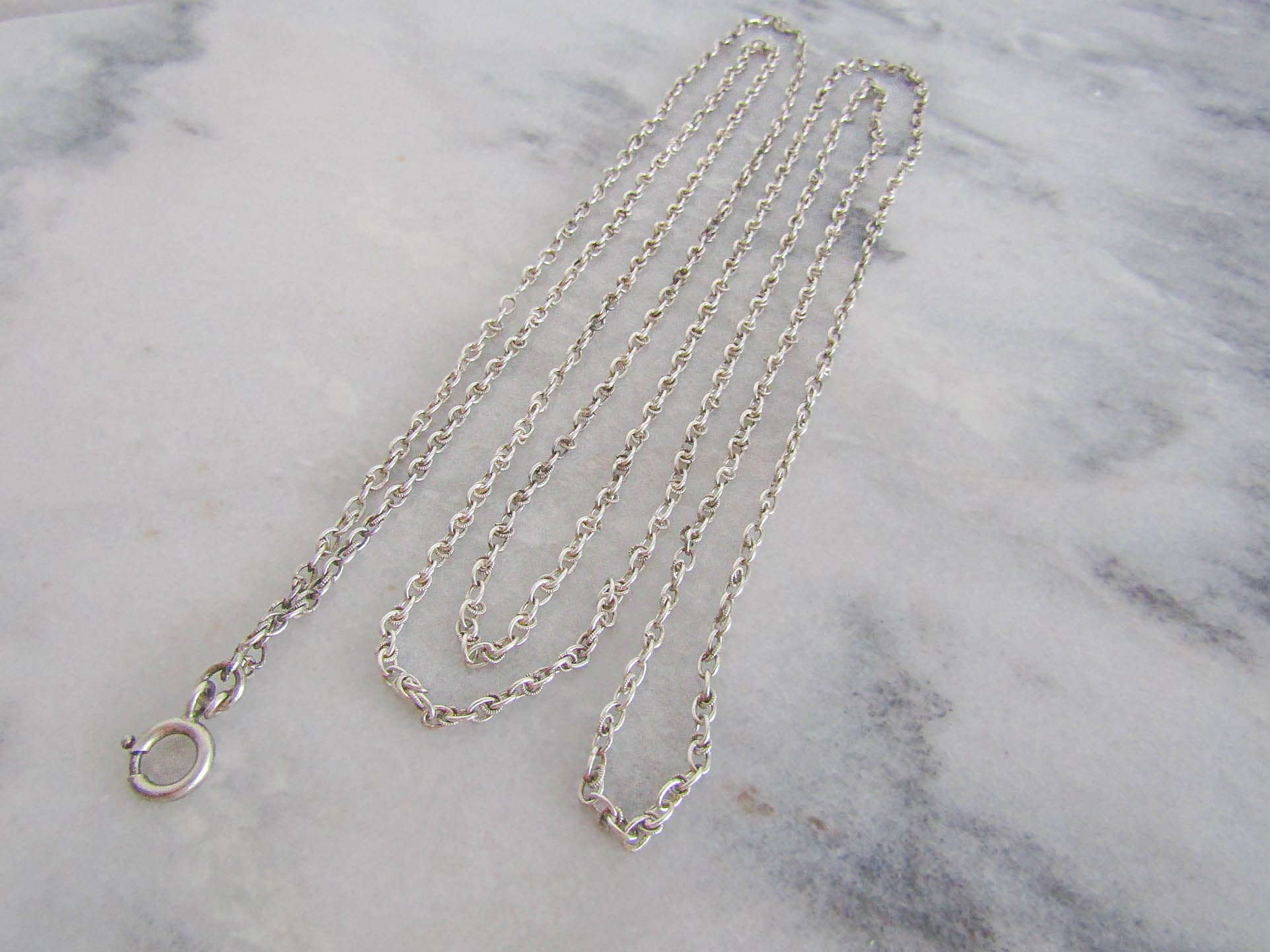 This is a beautiful Art Deco era long guard chain which is in excellent condition despite its age. It features trace chain with decorative textured hoops; a style popular in the inter-war period. It is getting harder to find full length long guard chains as they have often been divided with time to make smaller necklaces. Assayed in Paris and hallmarked with a boar's head, which guarantees between 800-900 silver purity. The hanging bolt ring can be used to clip a pendant or locket and the necklace is long enough to wrap two or three times over heard. A lovely example of Victorian silver work, it is in very good condition with links that are strong. A few of the decorative textured circles have come off, visible in photos if you look closely, but not noticeable when worn.