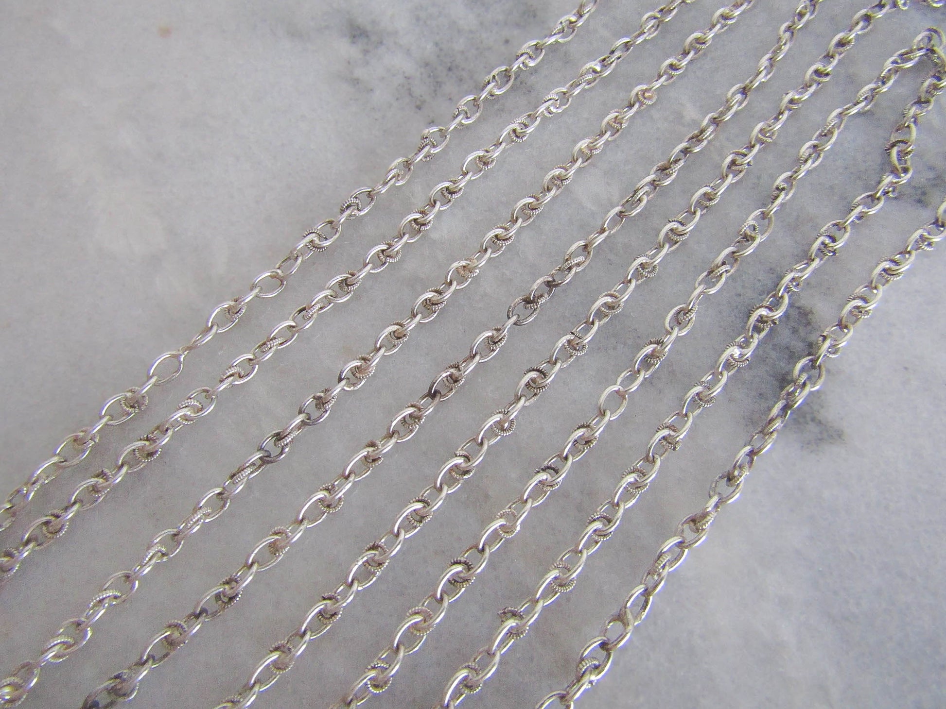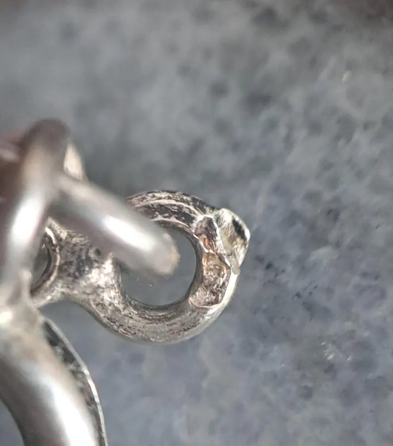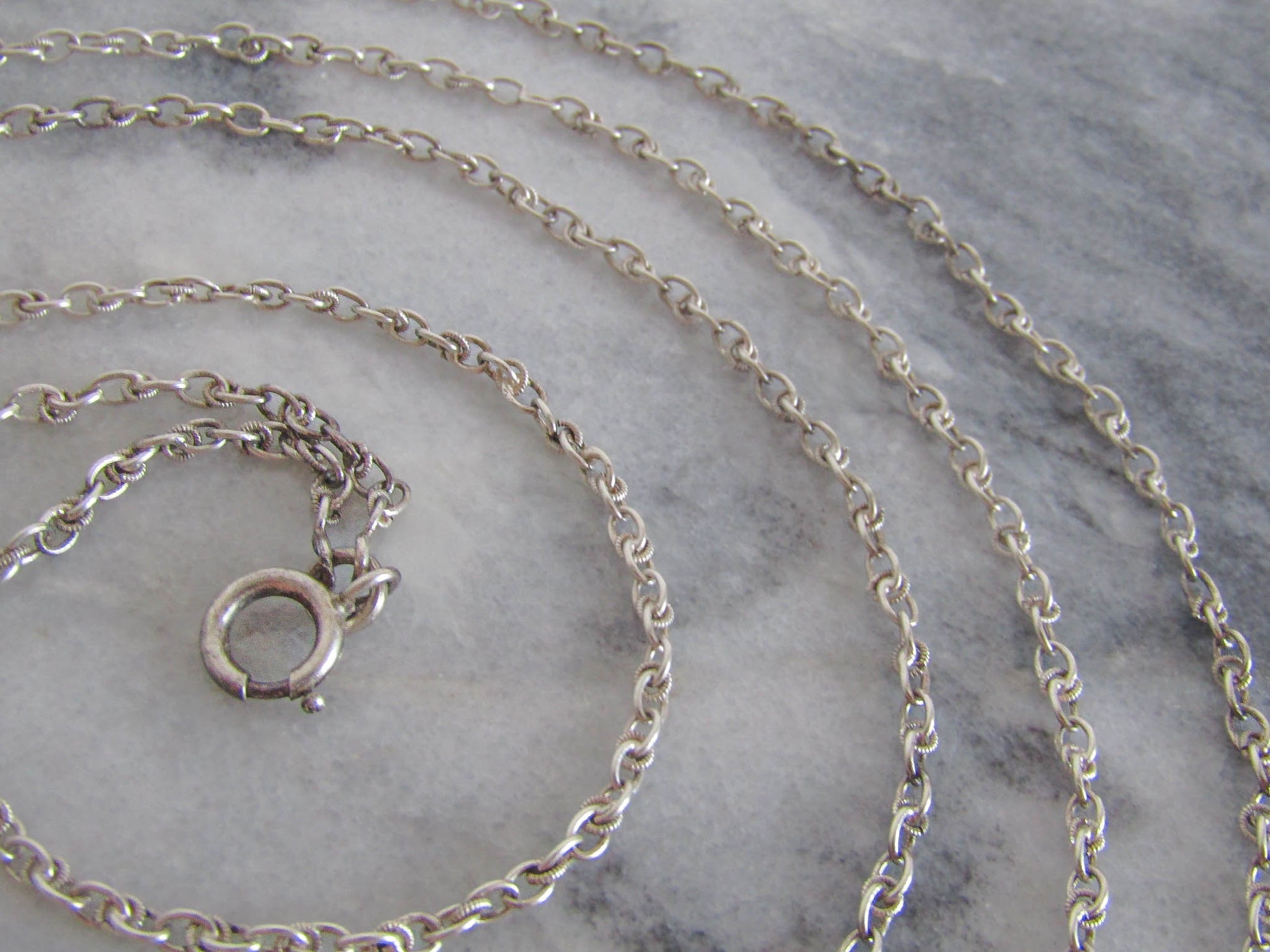 This is a beautiful Art Deco era long guard chain which is in excellent condition despite its age. It features trace chain with decorative textured hoops; a style popular in the inter-war period. It is getting harder to find full length long guard chains as they have often been divided with time to make smaller necklaces. Assayed in Paris and hallmarked with a boar's head, which guarantees between 800-900 silver purity. The hanging bolt ring can be used to clip a pendant or locket and the necklace is long enough to wrap two or three times over heard. A lovely example of Victorian silver work, it is in very good condition with links that are strong. A few of the decorative textured circles have come off, visible in photos if you look closely, but not noticeable when worn.