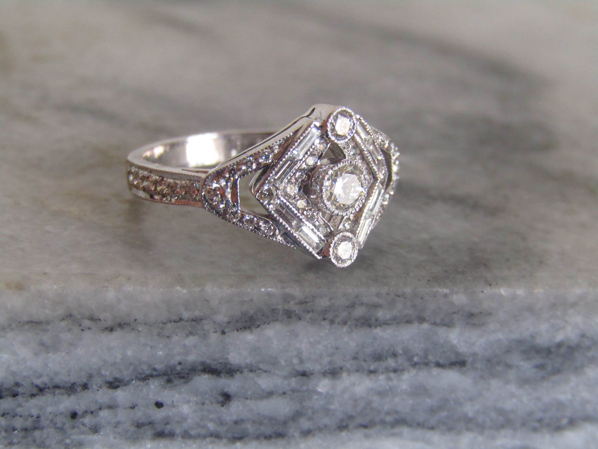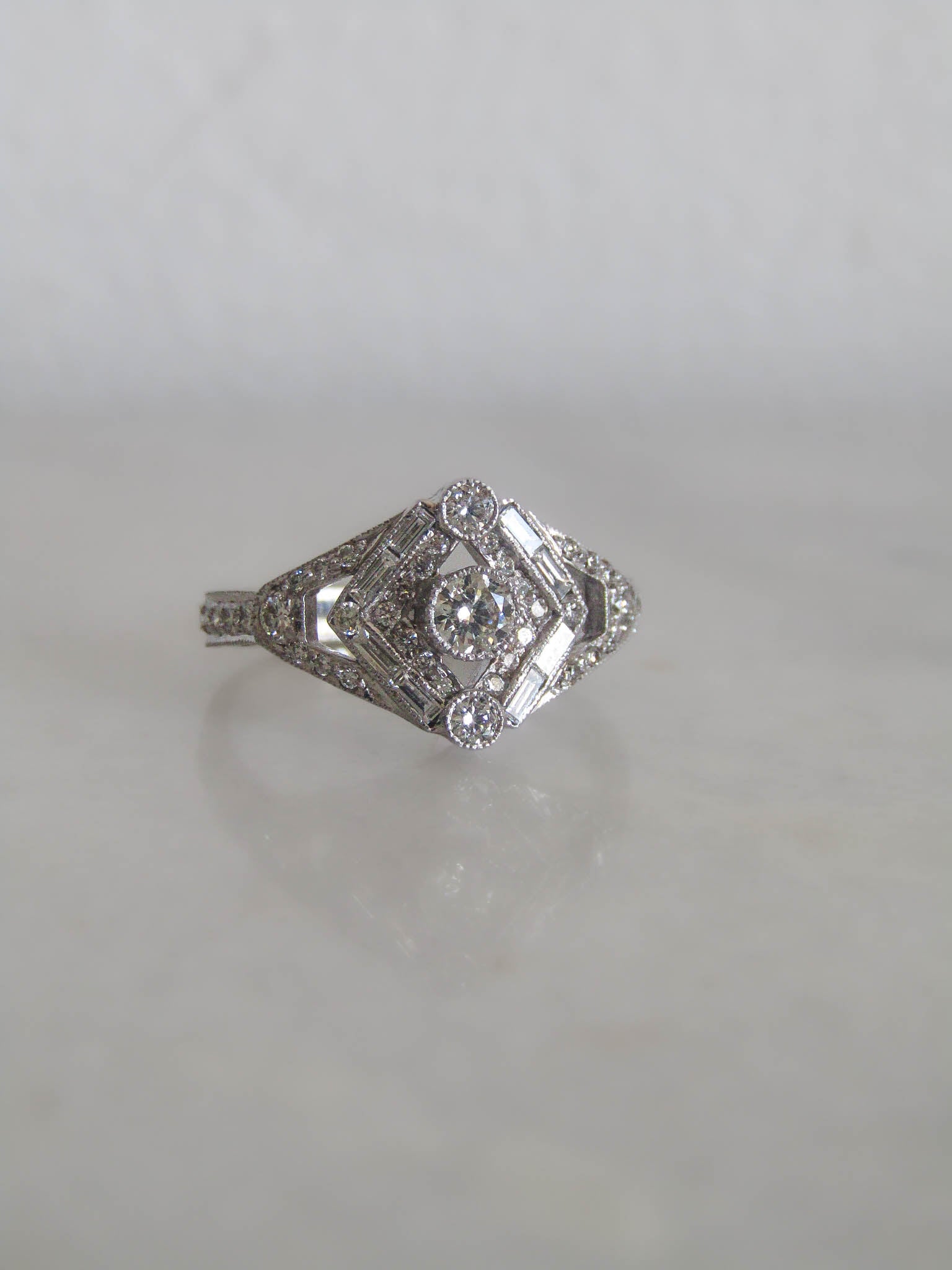 This lovely art deco style ring is a vintage find from before 2000. It features a central round brilliant cut diamond measuring approximately 3.2 mm x 3.2 mm x 2 mm and two smaller round brilliant cut diamonds above and below the central diamond measuring 2 mm x 2 mm x 1.4 mm. The central diamonds are surrounded by baguette cut diamonds and smaller round brilliant cuts on each side. The milgrain beadwork and tiny details capture the spirit of the art deco period with modern technology and handiwork. The ring would make a lovely engagement ring with its hard wearing stones and low, comfortable profile. It has a total of approximately 0.6 carats of diamonds.
