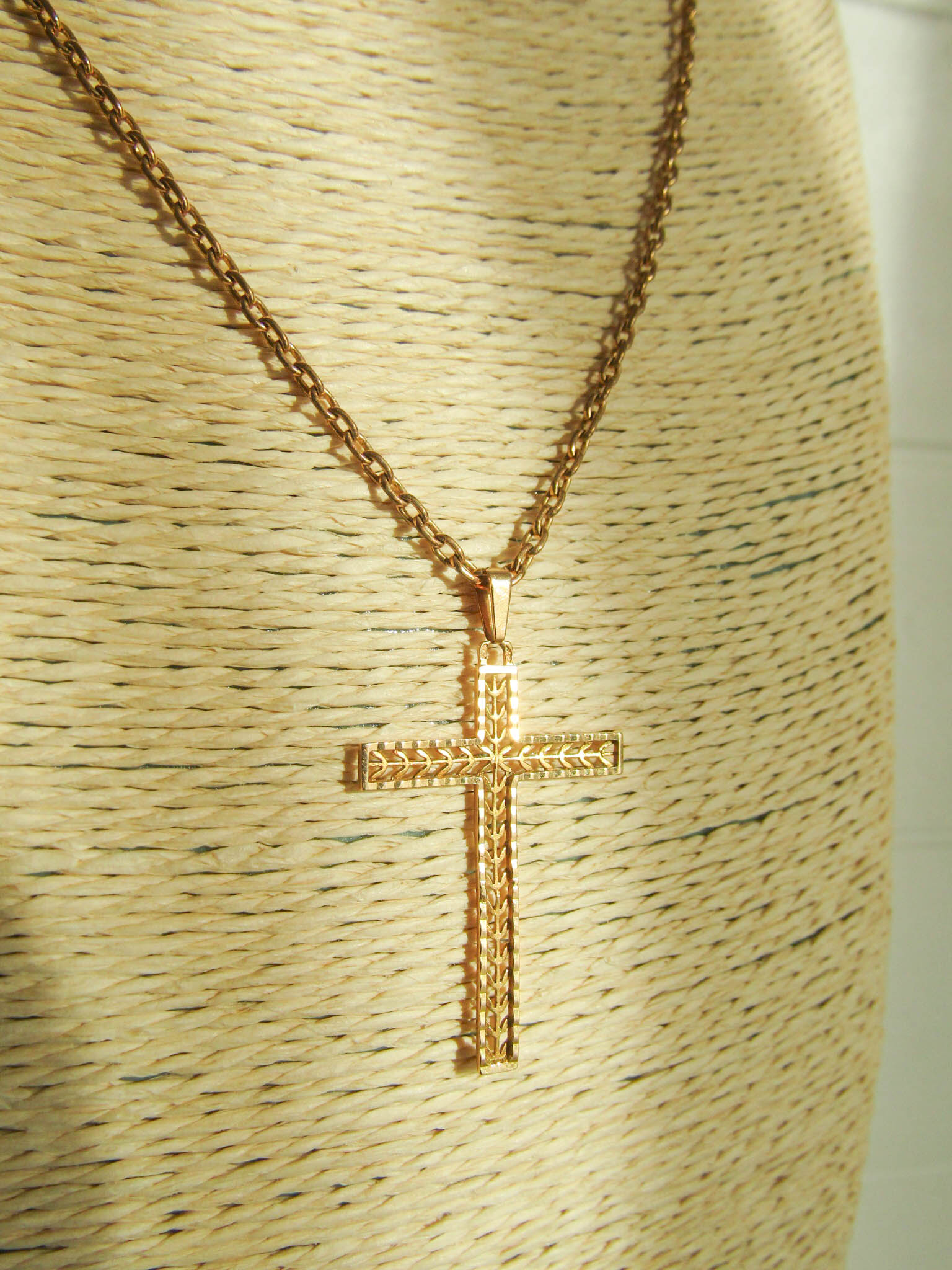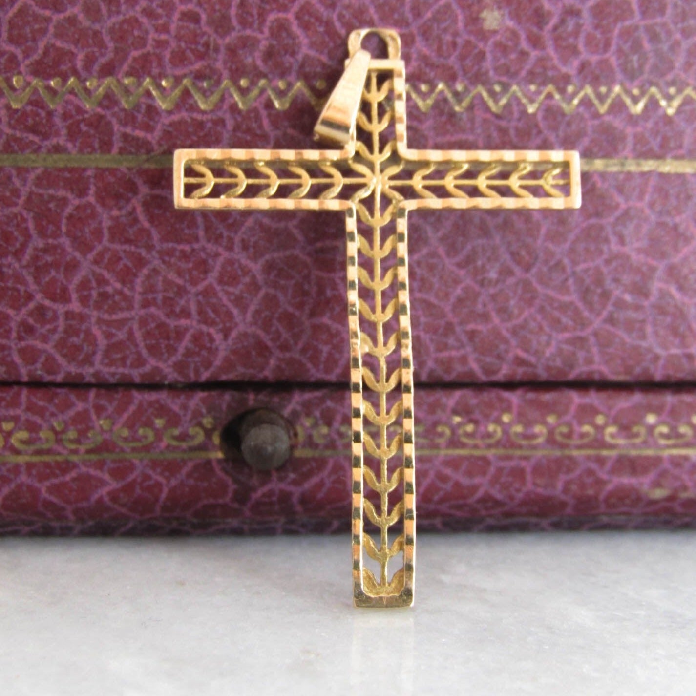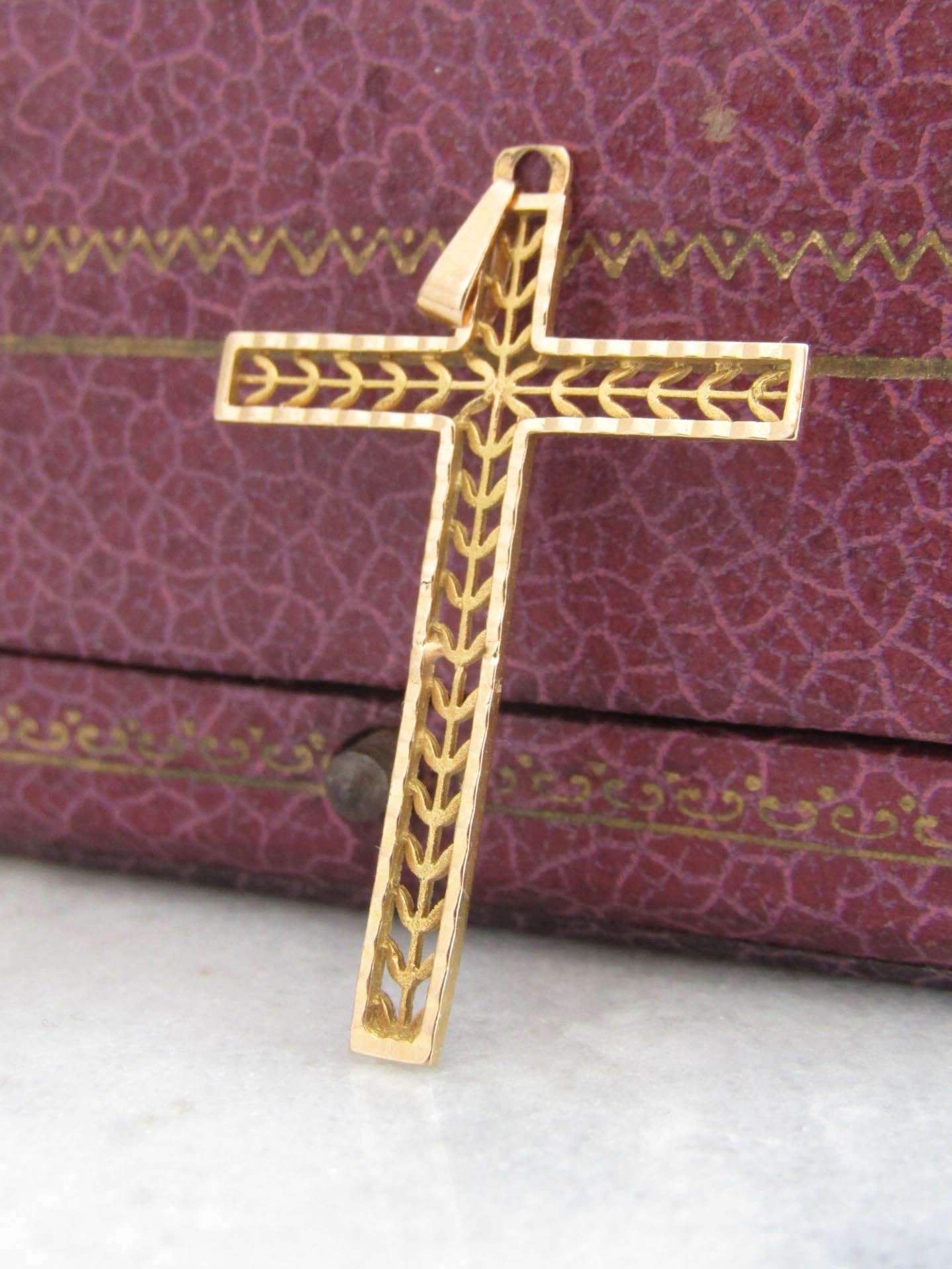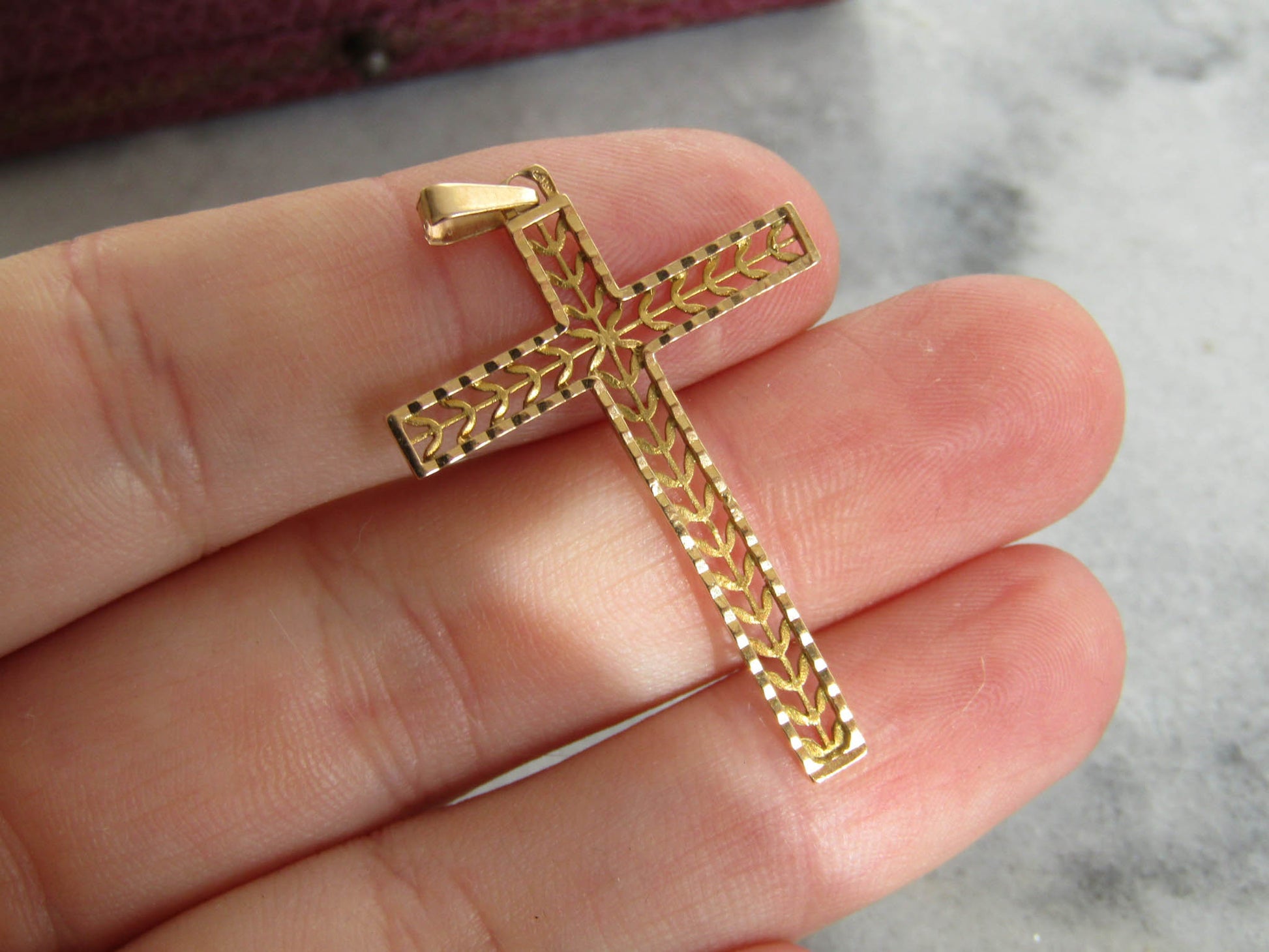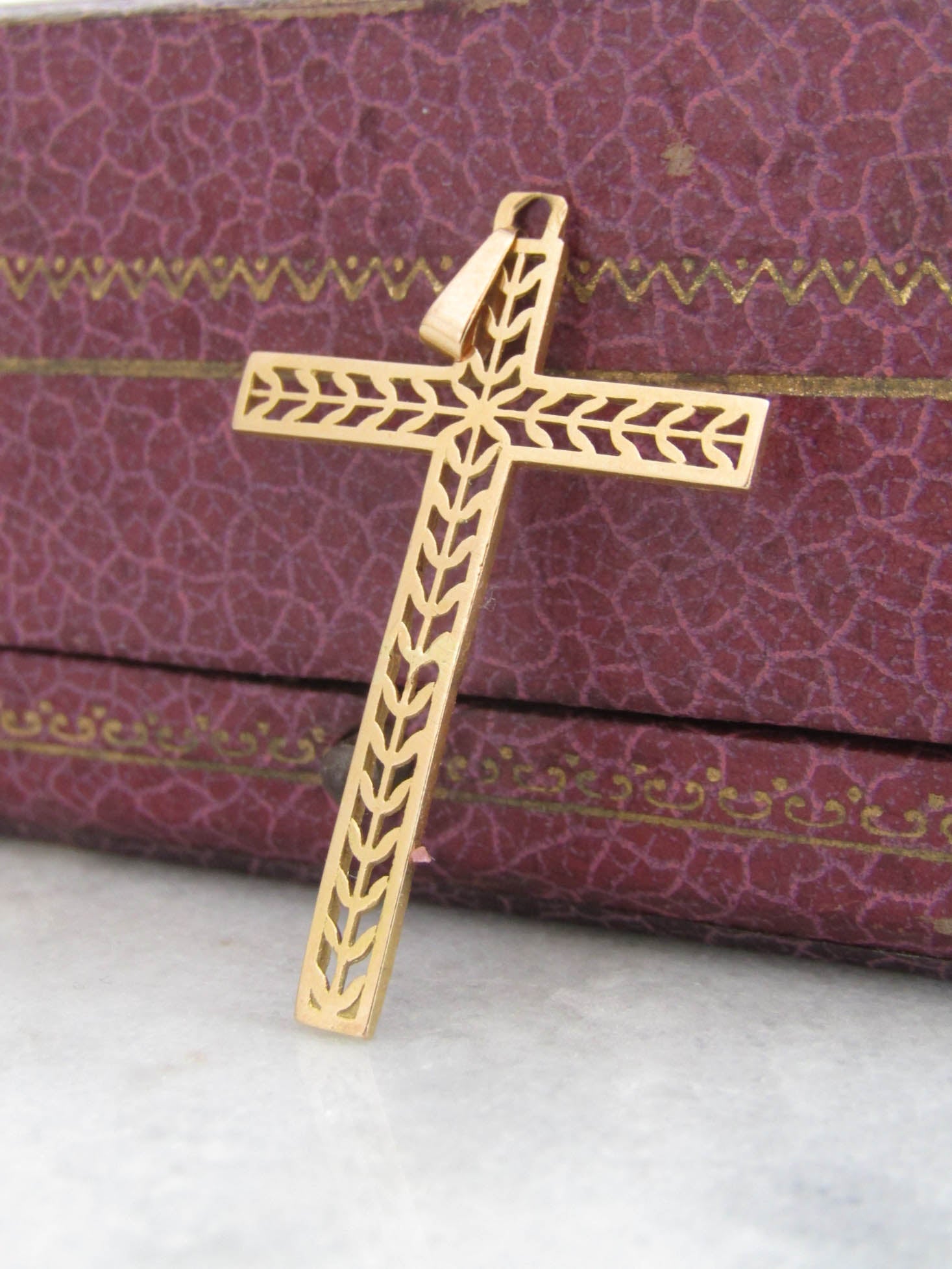 Simple, classic, and beautiful, this timeless baptism pendant is a vintage piece from around 1950s France. Featuring a lovely lacework interior and a ribbed border, the cross is small enough to wear comfortably, yet big enough to make an impression. It is hallmarked with an eagle head, guaranteeing at least 18k gold purity.