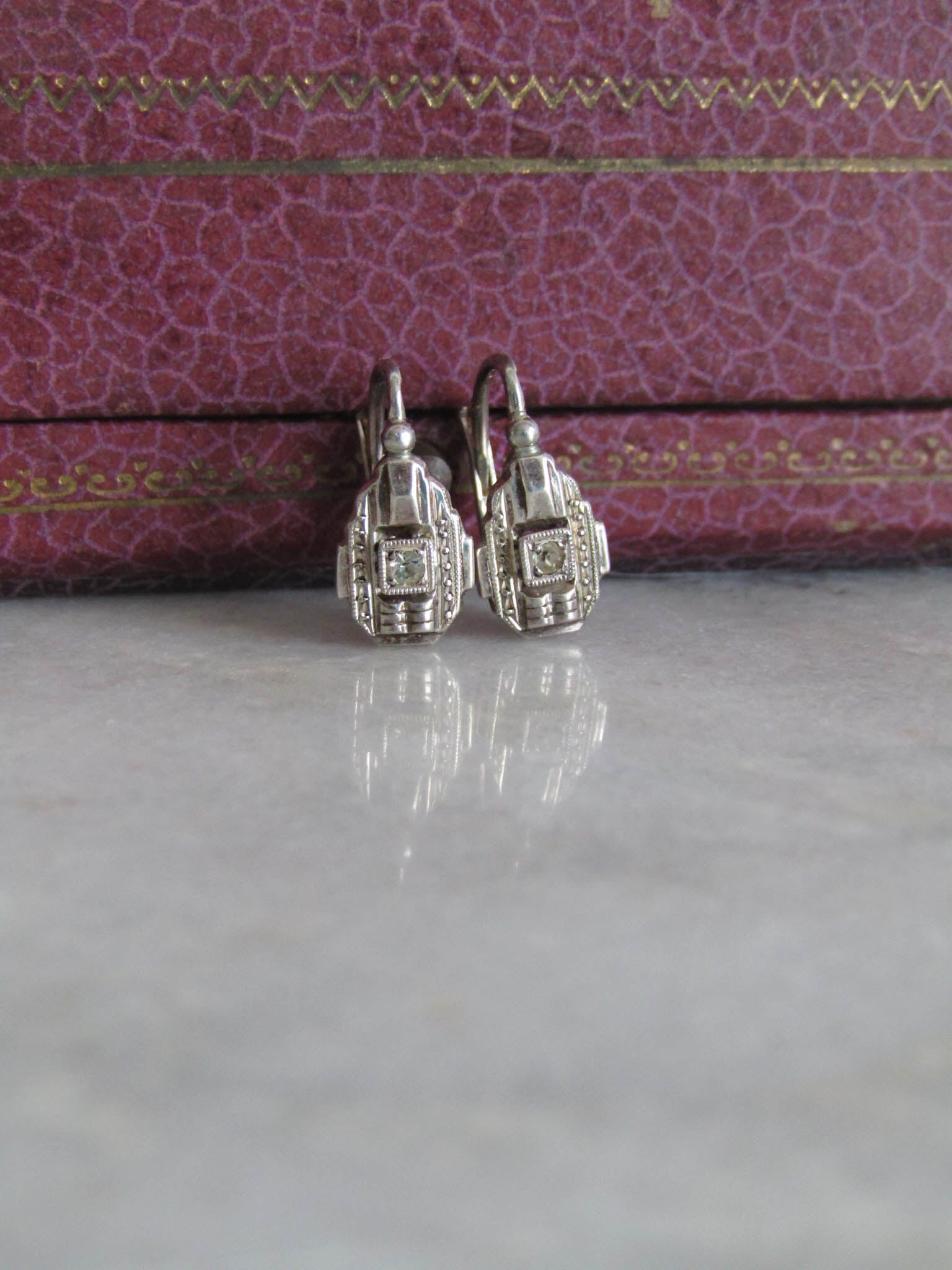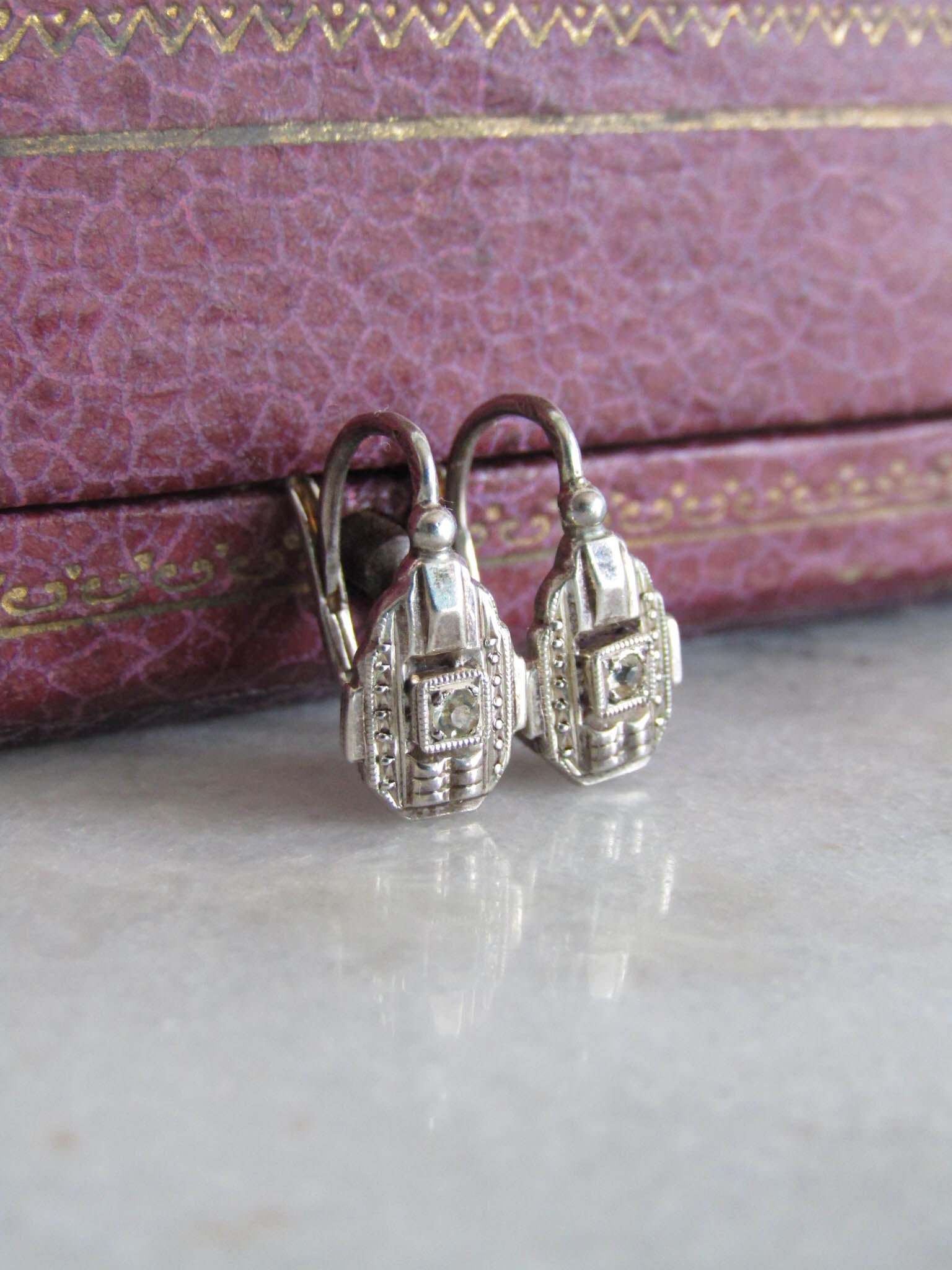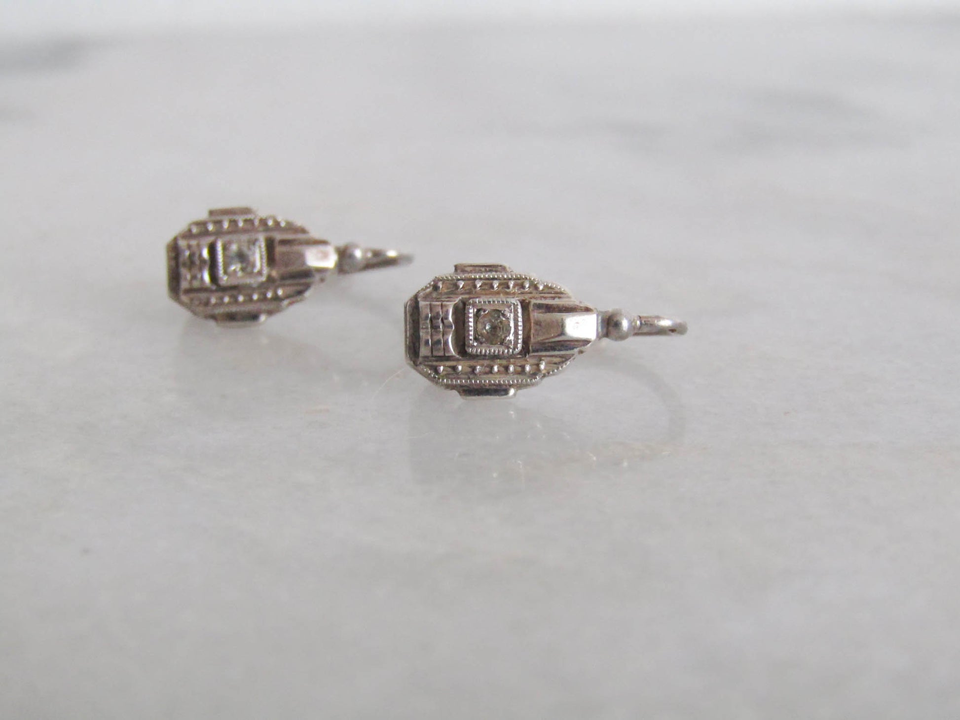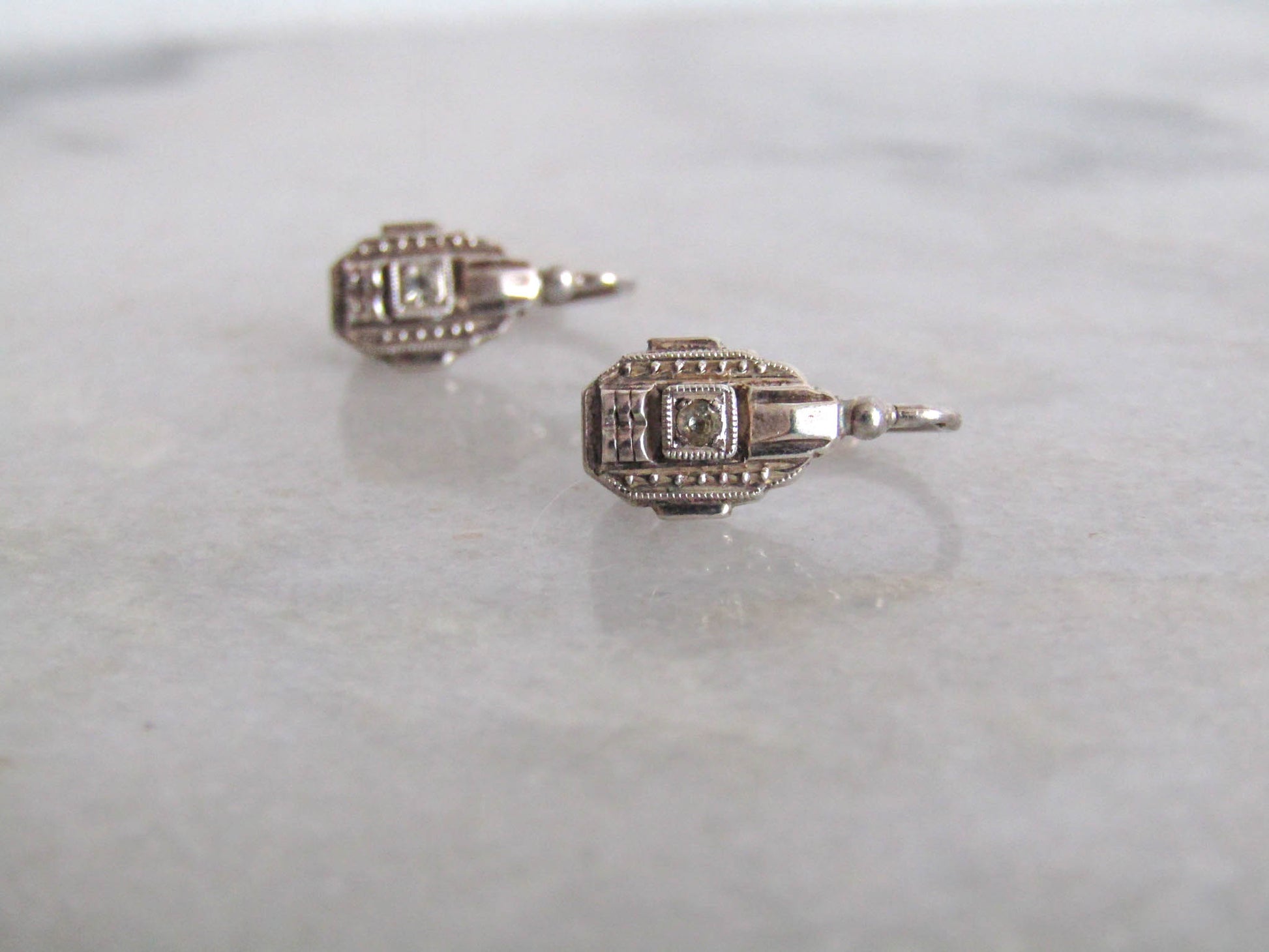 Small and delicate, these dainty Art Deco sleeper earrings present a fantastic example of the craftsmanship of the era. They feature geometric shapes, sharp lines, and a contrast between textured and smooth surfaces. They close with a practical lever back closure so they stay perfectly and effortlessly in place all day long. They would look amazing as part of any outfit. The earrings are lightweight and small, so do check the measurements. The earrings are part of deadstock and were never worn and as such are in excellent condition. They are embedded with two glass "paste" stones, common vintage diamond imitations.